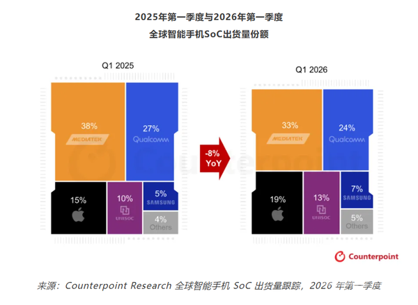 据CNMO了解,2026年第一季度高通和联发科手机SoC的出货量均出现下滑,高通同比下降3%,联发科同比下降5%。相比之下,苹果、三星和紫光展锐则实现了正增长,分别同比增长4%、2%和3%。