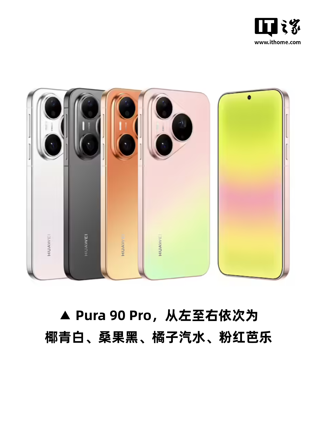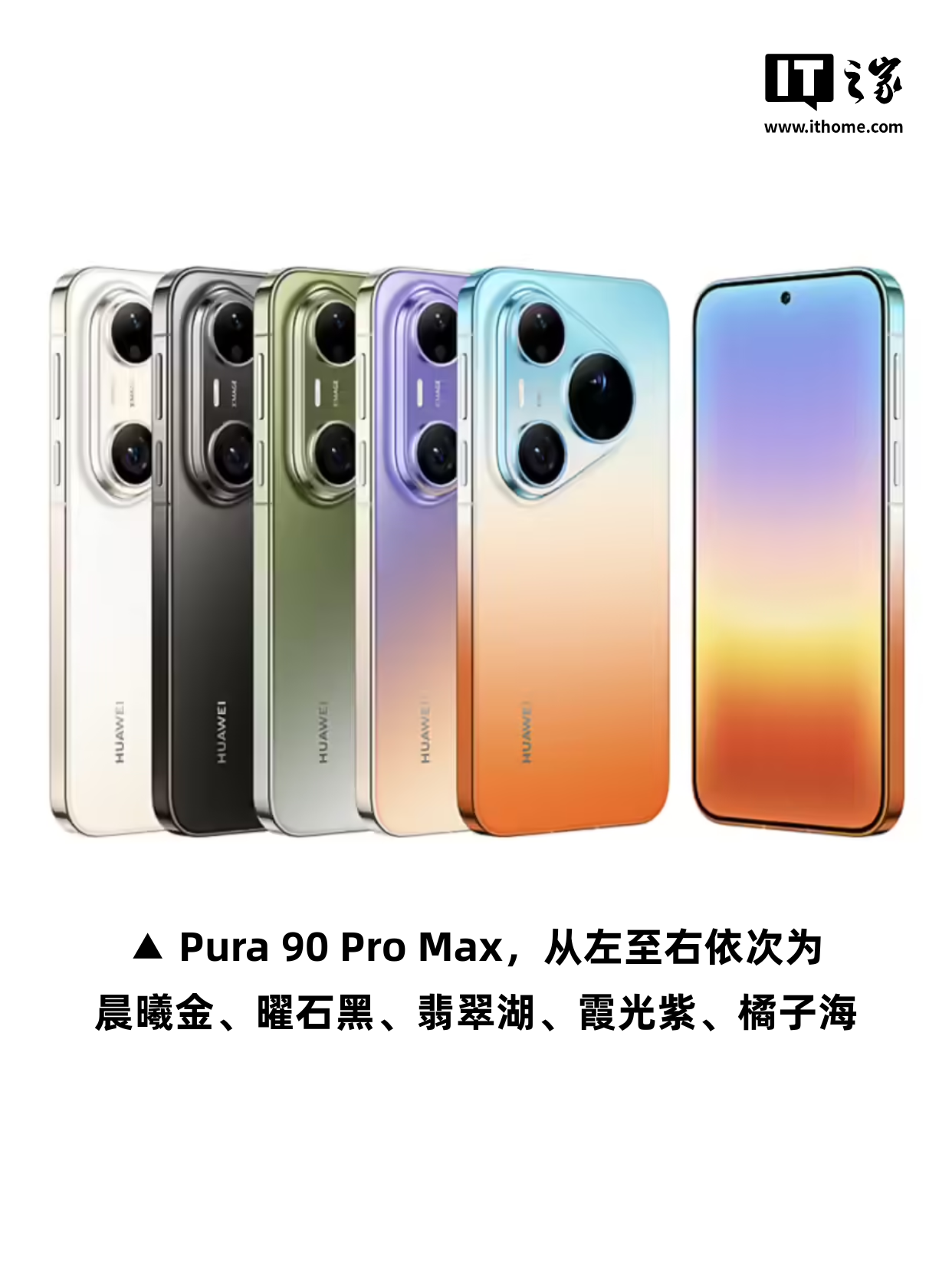 Pura 90 Pro Max 共有曜石黑、晨曦金、霞光紫、橘子海、翡翠湖 5 款配色;【图3】